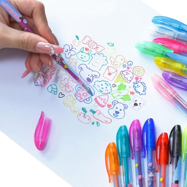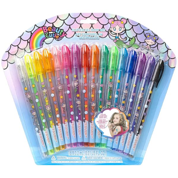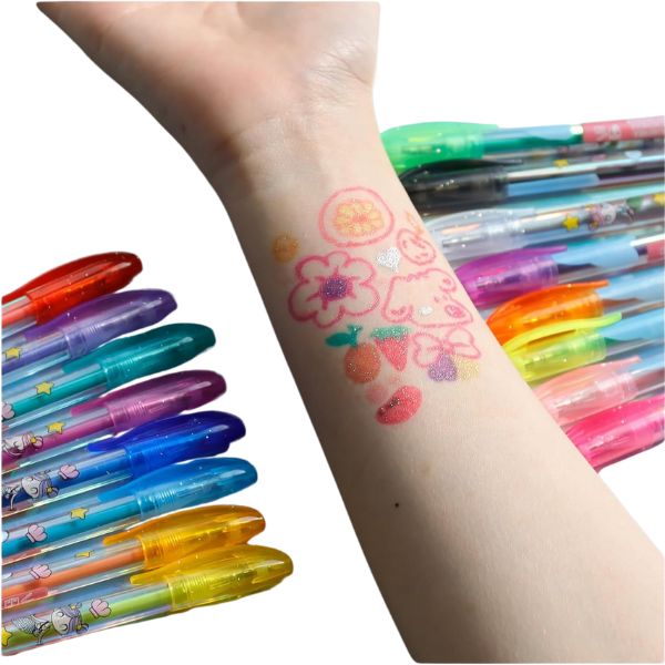 Set de arte corporal con 16 bolígrafos gel corporal con diamantina. Los colores incluyen varios tonos de rosa, verde, azul, rojo, negro, dorado, plateado y más.