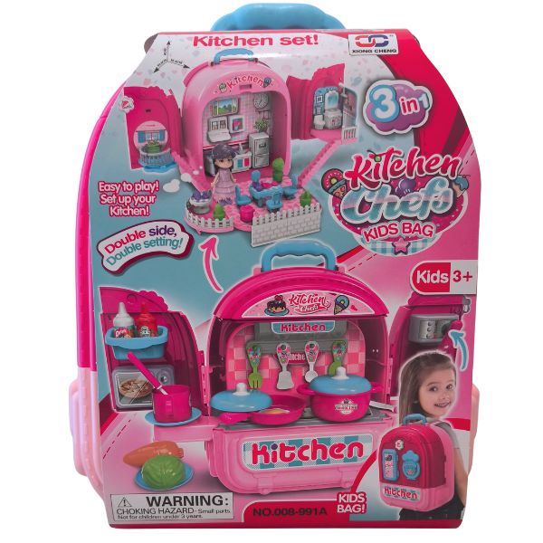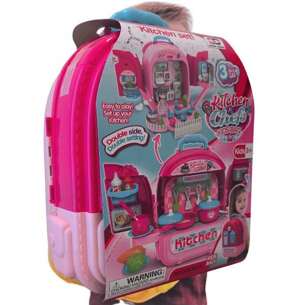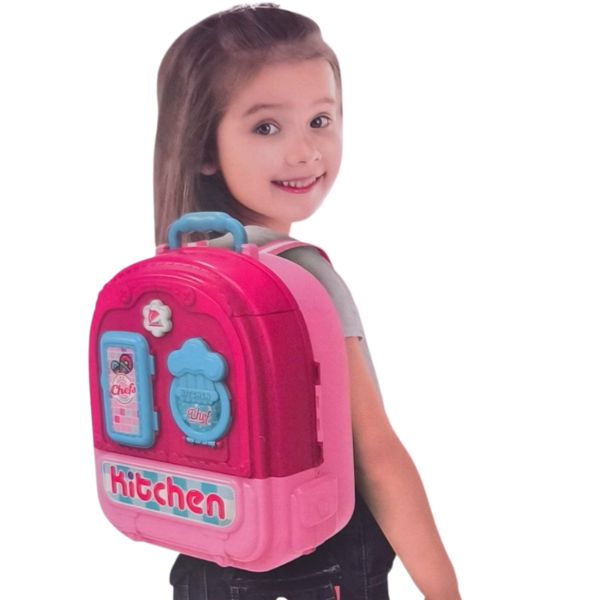 Tienda mochilita 3 en 1 que se transforma en una linda cocinita. Incluye más de 30pzas.