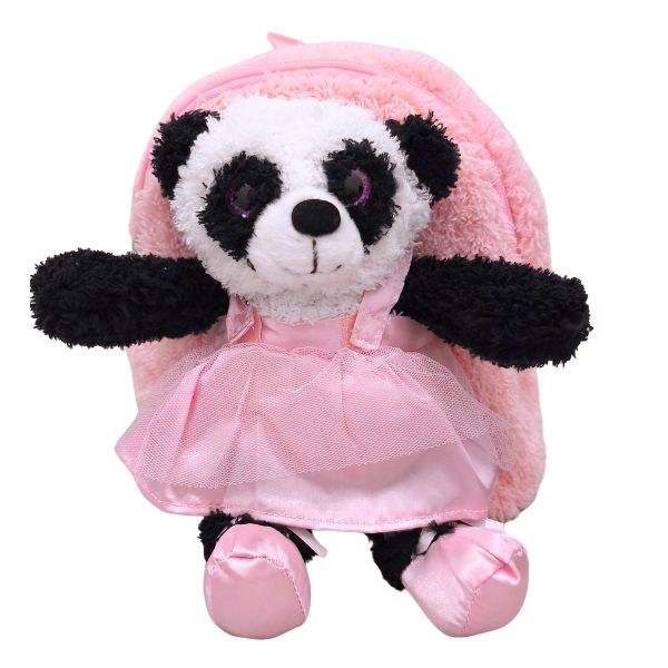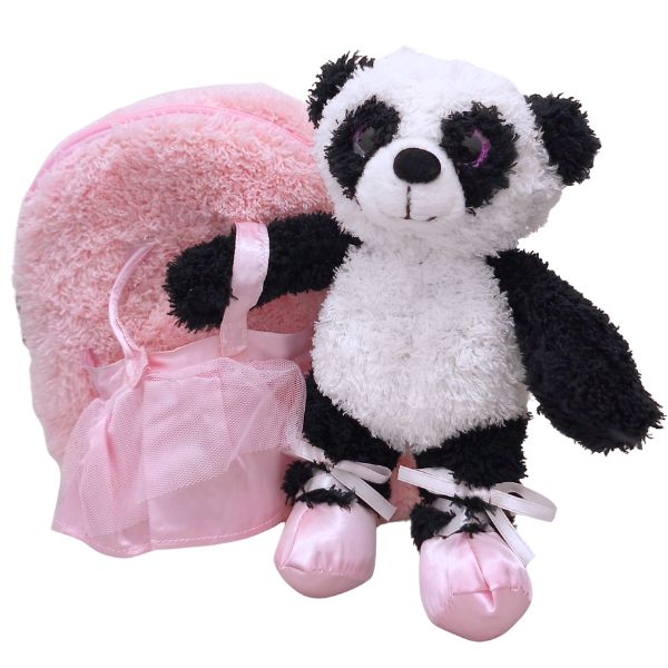 Linda mochilita de peluche con tierna pandita de felpa con tutu que se separa de ella.