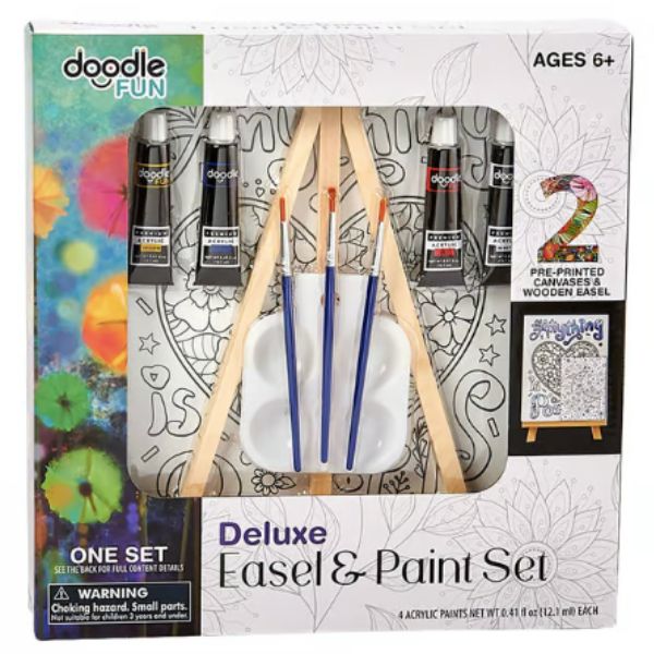 Incluye 4 pinturas acrílicas, 3 pinceles, 1 paleta de mezclas, 2 lienzos preimpresos y 1 caballete de madera.