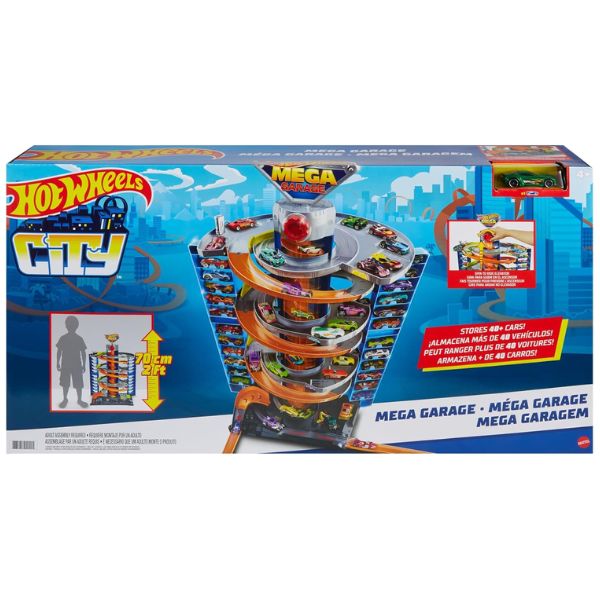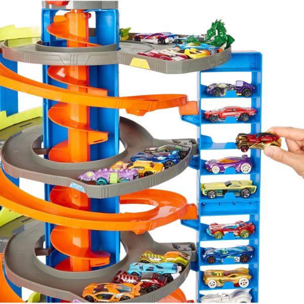 Set de juego de estacionamiento y pistas de varios niveles (70cm). Tiene capacidad para almacenar más de 40 a 60 vehículos Hot Wheels (los autos adicionales se venden por separado).