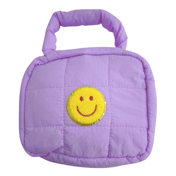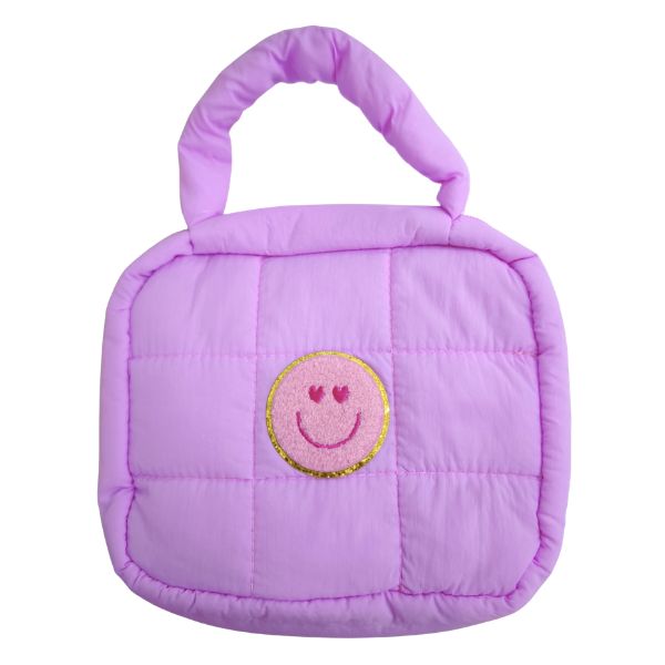 Neceser de cosméticos acolchado (estilo "puffer") en color rosa con un parche bordado de una carita feliz