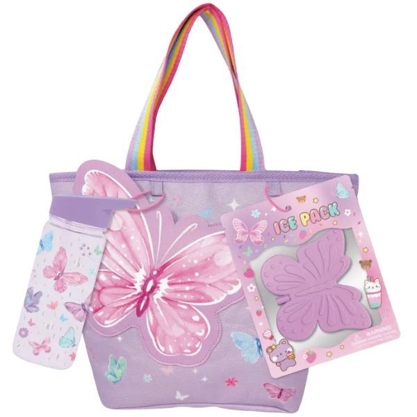 Prepara a tu peque para el regreso a clases con este juego de lonchera térmica con temática de mariposas, con una bolsa de hielo y una botella de agua a juego.
