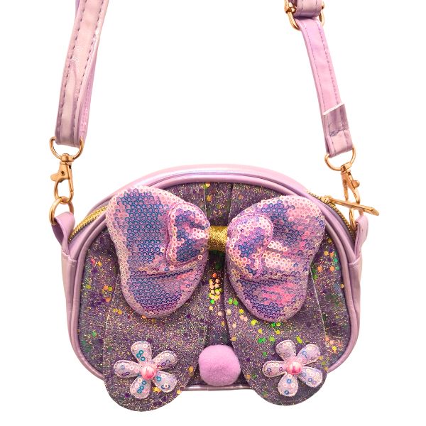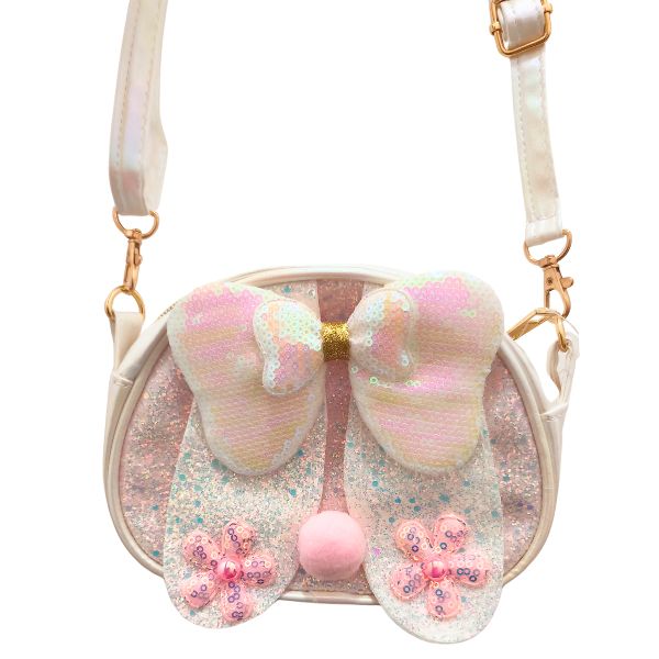 Tierna bolsita en colores perlados adornada con hermoso moño en brillantes lentejuelas.
