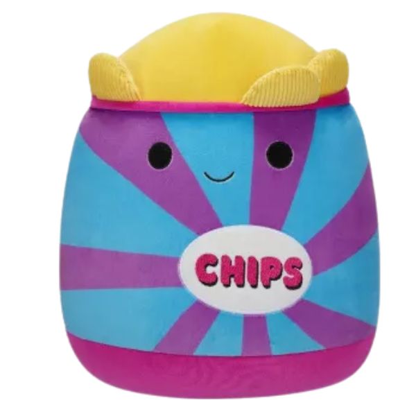 Squishmallow Patricia Chips es una tierna bolsa de papas chips en colores rosa morado, azul y amarillo perteneciente al Food Squad, mide 20cm.