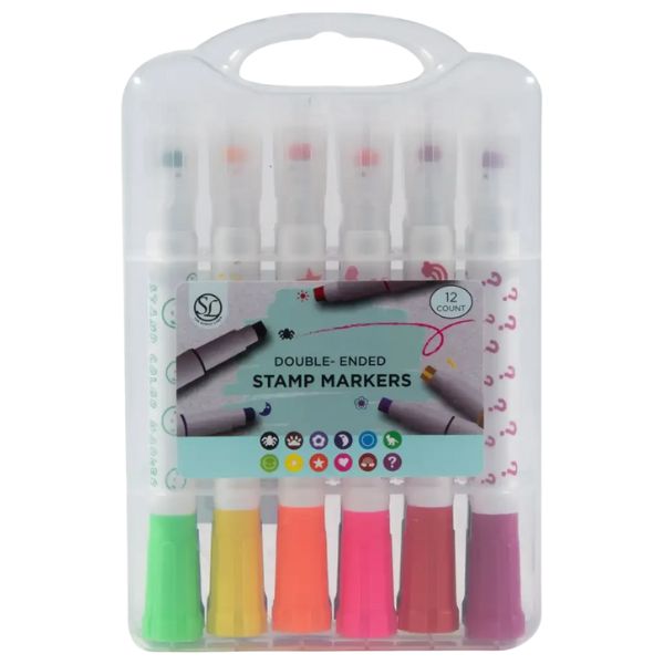 Ideal para proyectos creativos, este set de 12 marcadores tiene una punta que es para dibujar o escribir, y la otra tiene un sello con una forma divertida.