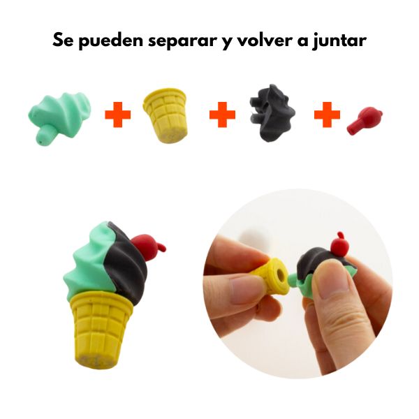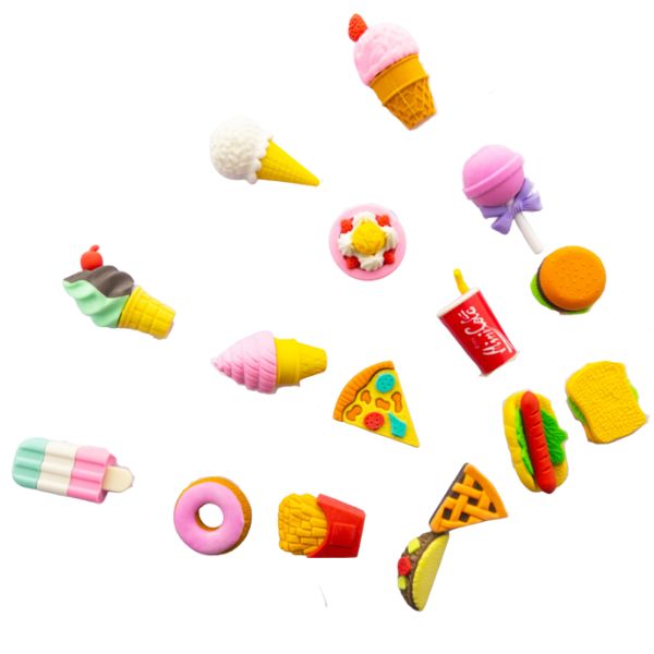 Borradores para lápices con temática de comida como hamburguesas, rebanadas de pizza, conos de helado y más.
