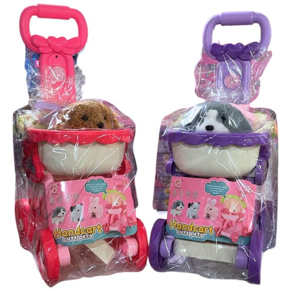 Linda carreola con tierna mascotita de perrito de peluche, ideal para las pequeñas amantes de los animales.