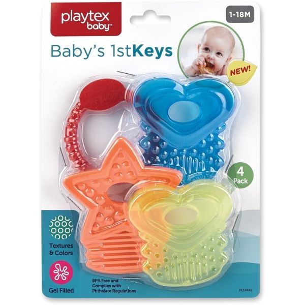 Paquete de 4 mordederas en forma de llave rellenos de gel para calmar las encías del bebé.