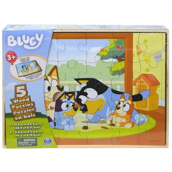 Increíble set que incluye cinco rompecabezas de madera con diferentes escenas y personajes de Bluey