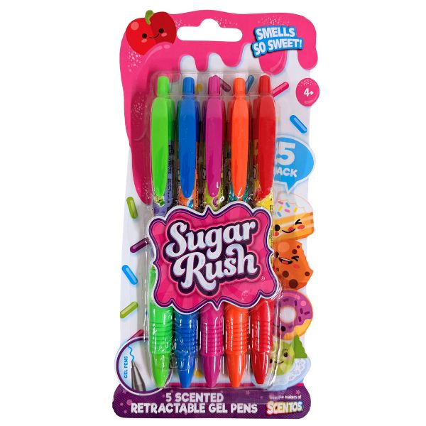 Paquete de 5 bolígrafos de gel perfumados retráctiles en 5 vibrantes colores.